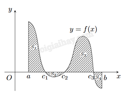 Ta có: \(\int\limits_a^b {f(x)dx} = \int\limits_a^{{c_1}} {f(x)dx} + \int\limits_{{c_1}}^{{c_2}} {f(x)dx} + \int\limits_{{c_2}}^{{c_3}} {f(x)dx} + \int\limits_{{c_3}}^b {f(x)dx} = {S_1} - {S_2} + {S_3} - {S_4}\).