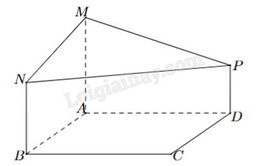Một phần thiết kế của một công trình đang xây dựng có dạng như hình bên, trong đó ABCD là hình vuông cạnh 6 m, AM, BN, DP cùng vuông góc với (ABCD), AM = 4 m, BN = 3 m và DP = 2 m. Góc giữa hai mặt phẳng (ABCD) và (MNP) là \({n^o}\) (làm tròn kết quả đến hàng đơn vị của độ, n là số nguyên dương). Giá trị của n là bao nhiêu?