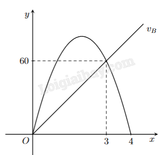 \({v_B}\) là đường thẳng đi qua hai điểm O(0;0) và M(3;60) nên \(\left\{ \begin{array}{l}0 = {a_B}.0 + {b_B}\\60 = {a_B}.3 + {b_B}\end{array} \right. \Leftrightarrow \left\{ \begin{array}{l}{b_B} = 0\\{a_B} = 20\end{array} \right. \Rightarrow y = 20x\).