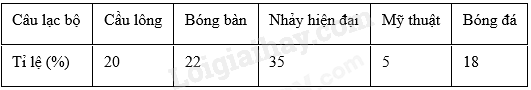 Câu 1: Dựa vào bảng số liệu sau, cho biết tỉ lệ phần trăm học sinh tham gia câu lạc bộ bóng bàn của học sinh khối 7?