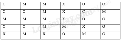 O : ổi; X: xoài; M: mận; C: cam.