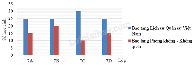 Khối lớp 7 của một trường trung học cơ sở có bốn lớp là 7A, 7B, 7C, 7D, mỗi lớp có 40 học sinh. Nhà trường cho học sinh khối lớp 7 đăng kí tham quan hai bảo tàng: Bảo tàng Lịch sử Quân sự Việt Nam và Bảo tàng Phòng không – Không quân. Mỗi học sinh chỉ đăng kí tham quan đúng một bảo tàng. Bạn Minh lập biểu đồ cột kép biểu diễn số lượng học sinh đăng kí tham quan hai bảo tàng trên của từng lớp. (như hình vẽ)