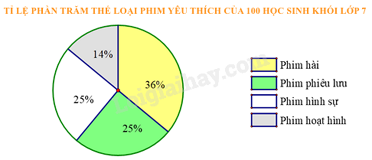 b) Loại phim được các bạn học sinh khối lớp 7 yêu thích nhất là phim hài với 36%.