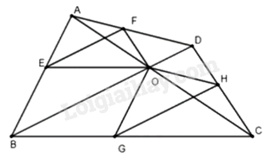 Cho tứ giác \({\rm{ABCD}}\) có \({\rm{AC}}\) và \({\rm{BD}}\) cắt nhau tại \({\rm{O}}\). Qua \({\rm{O}}\), kẻ đường thẳng song song với \({\rm{BC}}\) cắt \({\rm{AB}}\) tại \({\rm{E}}\), kẻ đường thẳng song song với \({\rm{CD}}\) cắt \({\rm{AD}}\) tại \({\rm{F}}\).