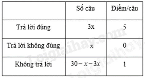 Gọi \(x\) là số câu trả lời không đúng \(\left( {x \in {\mathbb{N}^{\rm{*}}},x \le 30} \right)\).