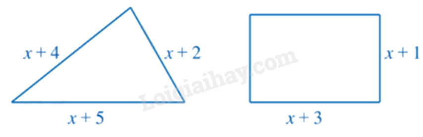 Hình tam giác và hình chữ nhật dưới đây có cùng chu vi. Viết phương trình biểu thị sự bằng nhau của chu vi hình tam giác, hình chữ nhật đó và tìm \(x\).