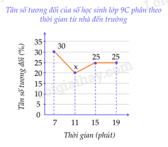 Thời gian đi từ nhà tới trường (đơn vị: phút) của các bạn học sinh lớp 9C được biểu diễn bởi biểu đồ tần số tương đối ghép nhóm dạng đoạn thẳng như sau: