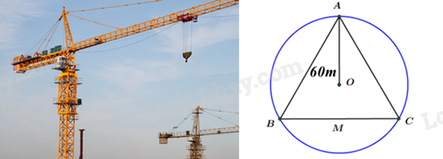Cẩu tháp là một loại thiết bị nâng hạ được thiết kế để nâng, hạ và di chuyền vật liệu xây dựng tại các công trường, đặc biệt là trong xây dựng các công trình cao tầng. Có khả năng hoạt động ở độ cao lớn và với tải trọng nặng, cẩu tháp được lắp đặt cố định hoặc có thể di chuyển trên ray tại công trường, giúp tăng hiệu quả công việc và đảm bảo an toàn lao động. Ba vị trí A, B, C của một công trình là ba đỉnh của một tam giác đều. Trên công trình, người ta muốn đặt cẩu tháp tại điểm O sao cho bán kính quay của cẩu tháp đến các vị trí điểm A, B, C bằng nhau và bằng 60 m (hình bên). Tính khoảng cách từ A đến B (làm tròn đến số hàng đơn vị).