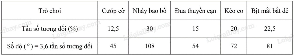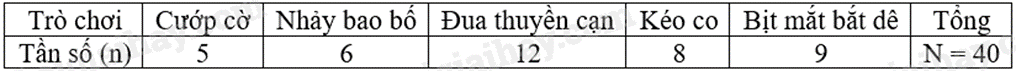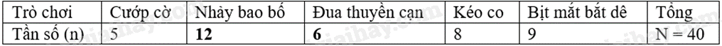 Tần số tương đối của trò Nhảy bao bố là: \(\frac{{12}}{{40}}.100\%  = 30\% \).
