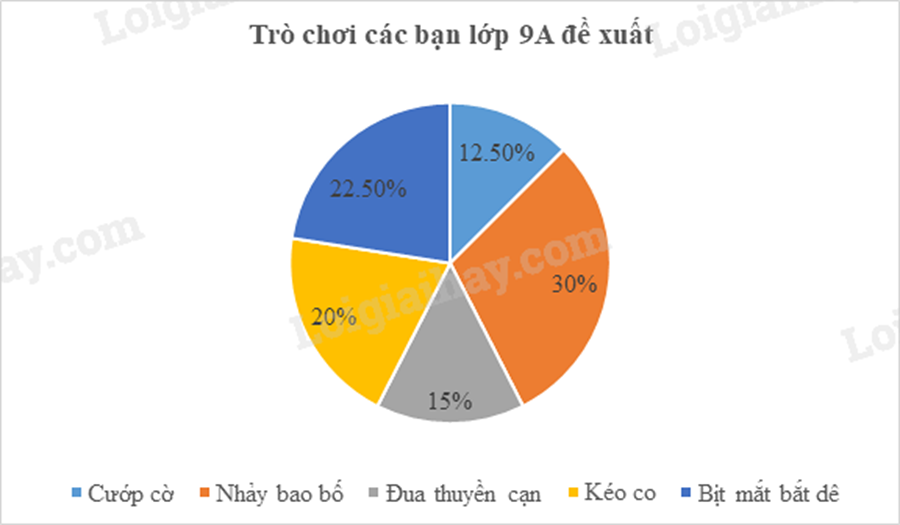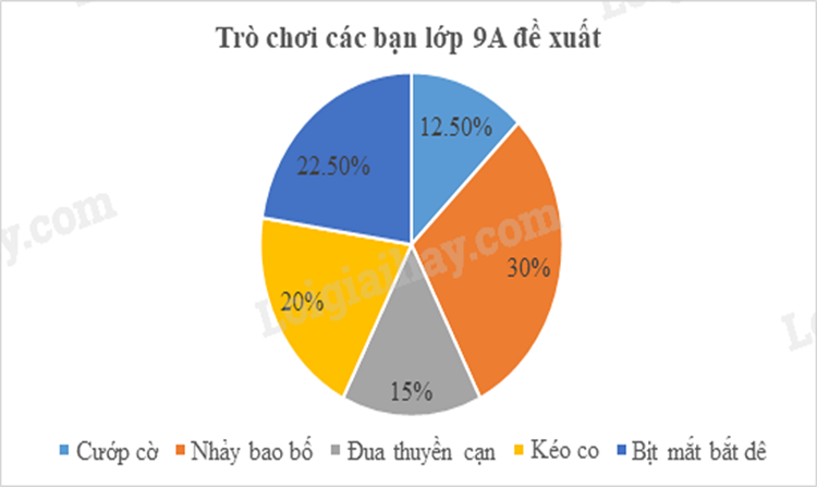 Vậy biểu đồ hình quạt tròn biểu diễn tần số tương đối của trò chơi các bạn lớp 9A đề xuất là: