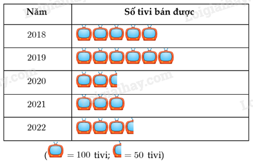 Từ biểu đồ tranh, ta thấy số ti vi bán được của các năm 2018; 2019; 2020; 2021; 2022 lần lượt là: 500; 600; 250; 300; 350.
