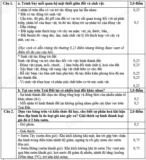 Câu 1. (3,0 điểm) Trình bày mối quan hệ mật thiết giữa đất và sinh vật. Tại sao trên Trái Đất có nhiều loại đất khác nhau?