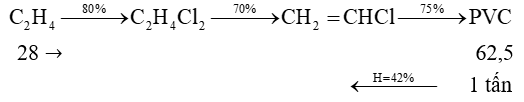 Khối lượng ethylene cần dùng là: \(\frac{{1.28}}{{62,5}}:42\% = 0,95\)tấn