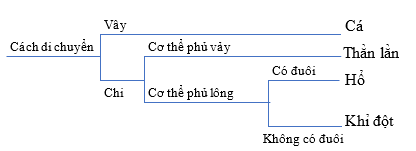 Các cặp đặc điểm được sử dụng là di chuyển bằng vây/chi; cơ thể phủ vảy/lông; có đuôi/không đuôi.