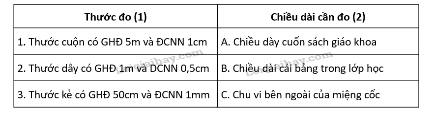 Câu 5: Chọn thước đo thích hợp ở cột 1 để đo các chiều dài tương ứng ở cột 2 trong bảng dưới đây: