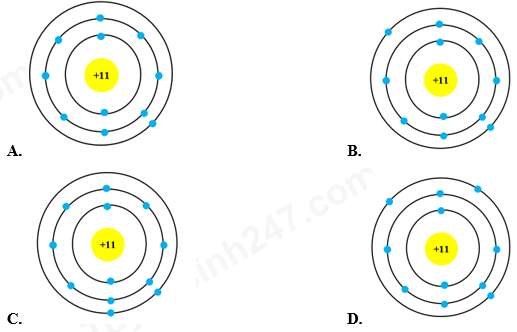 Câu 7: Mô hình cấu tạo nào dưới đây của nguyên tử của sodium, biết số electron của nguyên tử sodium là 11.