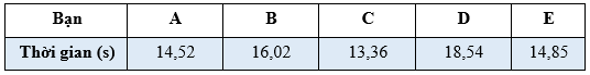 Câu 15: Trong cuộc thi chạy 100m ở trường, thành tích của 5 bạn được ghi ở bảng số liệu sau: