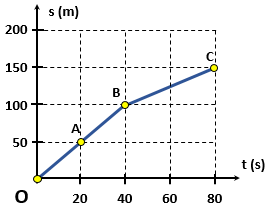 Câu 16: Một con rái cá bơi trên một dòng sông được quãng đường 100m trong 40s, sau đó nó thả mình trôi theo dòng nước 50m trong 40s. Đồ thị quãng đường – thời gian của rái cá được cho ở hình dưới đây. Tốc độ của dòng nước là: