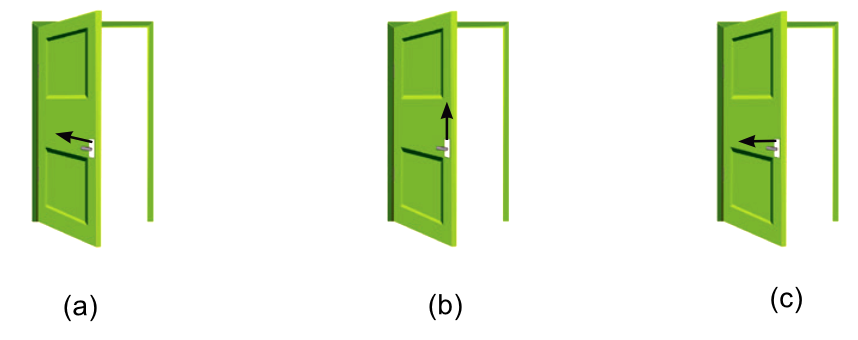 Trường hợp (a) lực tác dụng vào cánh cửa có giá cắt trục quay, nên không làm quay cánh cửa