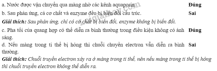 Các phát biểu sau đây là đúng hay sai? Nếu sai hãy giải thích. a. Nước được vận chuyển qua màng nhờ các kênh aquaporin. b. Sau phản ứng, cả cơ chất và enzyme đều bị biến đổi cấu trúc. c. Pha tối của quang hợp có thể diễn ra bình thường trong điều kiện không có ánh sáng. d. Nếu màng trong ty thể bị hỏng thì chuỗi chuyền electron vẫn diễn ra bình thường. |