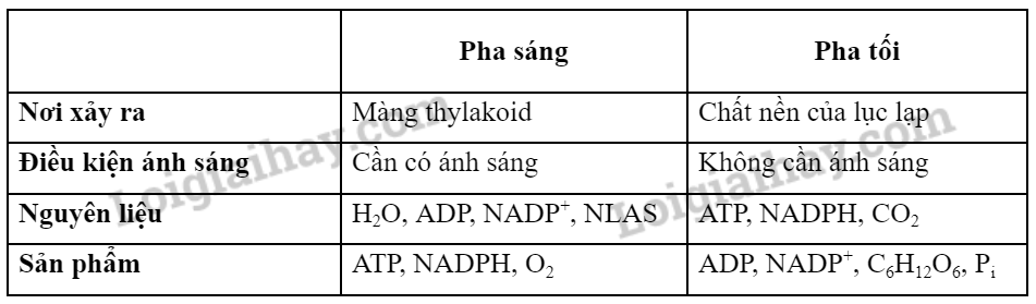 | Hãy phân biệt pha sáng và pha tối của quang hợp về: nơi diễn ra, điều kiện ánh sáng, nguyên liệu tham gia và sản phẩm. |