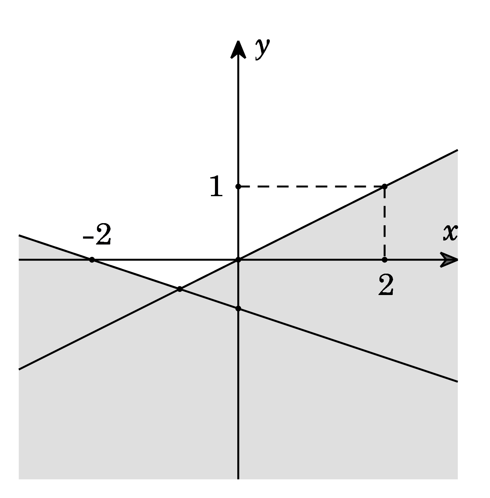 A. \(\left\{ \begin{array}{l}x - 2y \le 0\\x + 3y \ge - 2\end{array} \right..\) B. \(\left\{ \begin{array}{l}x - 2y > 0\\x + 3y < - 2\end{array} \right..\) C. \(\left\{ \begin{array}{l}x - 2y \le 0\\x + 3y \le - 2\end{array} \right..\) D. \(\left\{ \begin{array}{l}x - 2y < 0\\x + 3y > - 2\end{array} \right..\)