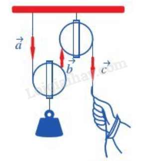 Quan sát ròng rọc hoạt động khi dùng lực để kéo một đầu của ròng rọc. Chuyển động của các đoạn dây được mô tả bằng các vectơ $\overset{\rightarrow}{a},\overset{\rightarrow}{b},\overset{\rightarrow}{c}$ (hình vẽ). Chọn khẳng định sai trong các khẳng định sau.