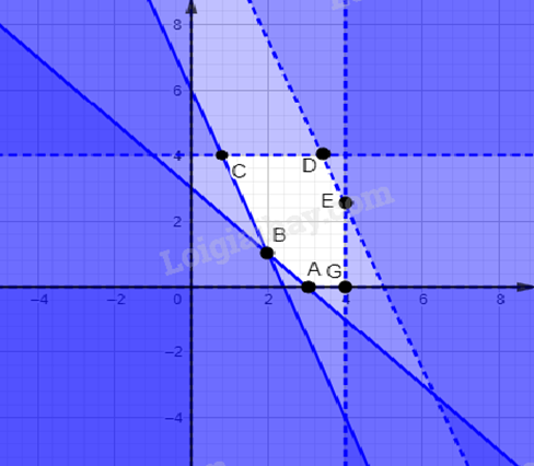 Miền nghiệm của bất phương trình là ngũ giác ABCDEG, trong đó tọa độ các đỉnh là A(3; 0), B(2; 1), \(C\left( {\frac{4}{5};4} \right)\), \(D\left( {\frac{{17}}{5};4} \right)\), \(E\left( {4;\frac{5}{2}} \right)\), G(4; 0).