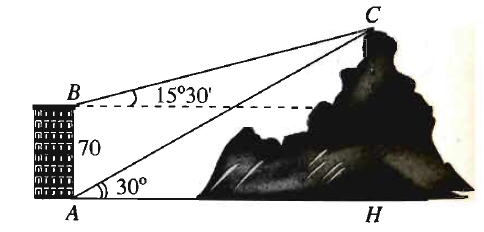 Câu 2: (1 điểm) Từ hai vị trí \(A\) và \(B\) của một tòa nhà, người ta quan sát đỉnh \(C\) của ngọn núi. Biết rằng độ cao \(AB = 70{\rm{m}}\), phương nhìn \(AC\) tạo với phương nằm ngang góc \({30^0}\), phương nhìn \(BC\) tạo với phương nằm ngang góc \({15^0}30'\). Tìm độ cao của ngọn núi đó có độ cao so với mặt đất.