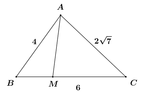 Câu 22: Tam giác ABC có AB = 4, BC = 6, \(AC = 2\sqrt 7 \). Điểm M thuộc đoạn BC sao cho MC = 2MB. Tính độ dài cạnh AM.