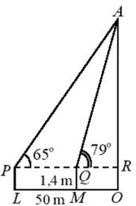 Câu 11: Để xác định chiều cao của một toà nhà cao tầng, một người đứng tại điểm M, sử dụng giác kế nhìn thấy đỉnh toà nhà với góc nâng \(\angle RQA = {79^0}\), người đó lùi ra xa một khoảng cách LM = 50 m thì nhìn thấy đỉnh toà nhà với góc nâng \(\angle RPA = {65^0}\). Hãy tính chiều cao của toà nhà (làm tròn đến chữ số thập phân thứ nhất), biết rằng khoảng cách từ mặt đất đến ống ngắm của giác kế đó là PL = QM = 1,4m.