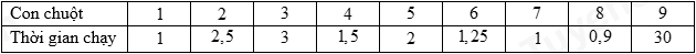 Câu 20: Quan sát 9 con chuột chạy quanh một căn phòng và ghi lại thời gian (tính bằng phút) của chúng trong bảng sau: