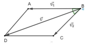 Ta có: \(\overrightarrow v = \overrightarrow {{v_1}} + \overrightarrow {{v_2}} \) và \((\overrightarrow {{v_1}} ,\overrightarrow {{v_2}} ) = {45^o}\).