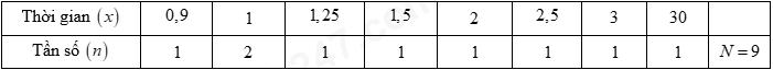 +) Vì \(N = 9\) (lẻ) \( \Rightarrow \) Số trung vị \({M_e} = {x_{\frac{{N + 1}}{2}}} = {x_5} = 1,5\) (phút)