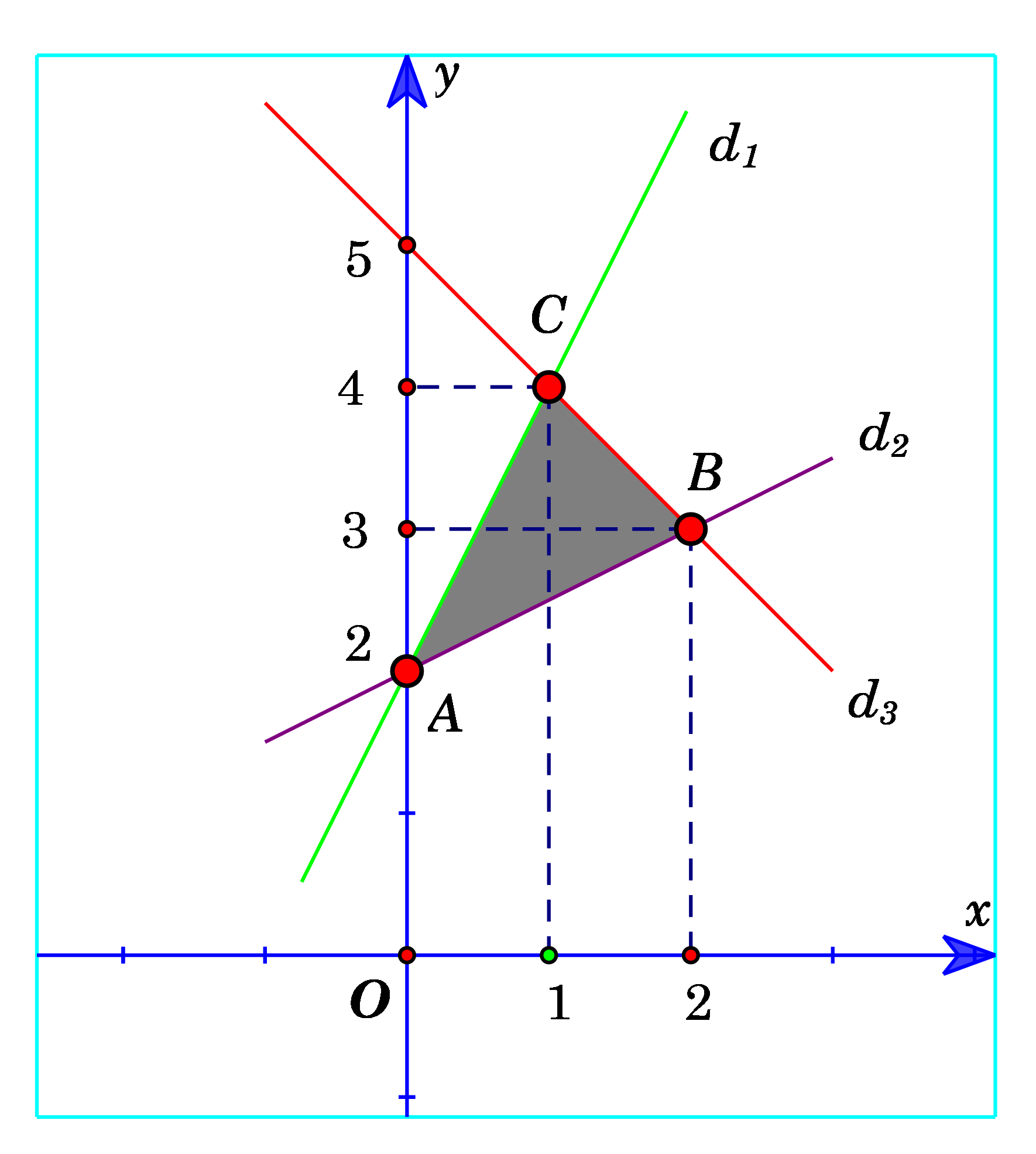\(\begin{array}{l}{d_1}:y - 2x - 2 = 0,\,\,{\rm{ }}{d_2}:2y - x - 4 = 0,{\rm{ }}\\{\rm{ }}{d_3}:x + y - 5 = 0.\end{array}\)
