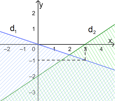 \({d_2}\) đi qua \((3;0)\) và \((0; - 2)\), suy ra \({d_2}:2x - 3y = 6\) (Loại C)