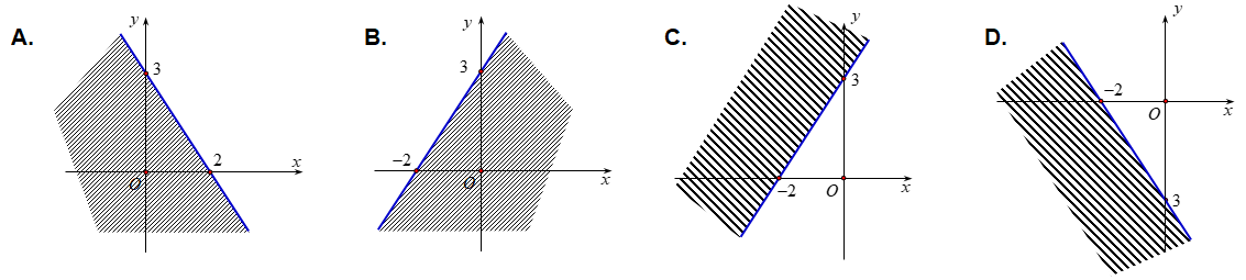 Vì điểm (0,0) và (3,0) thuộc miền nghiệm nên hình vẽ A đúng.