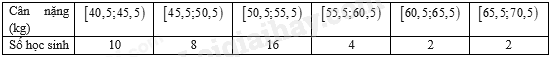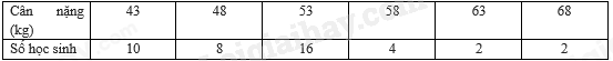 Cân nặng trung bình của học sinh lớp 11A là: \(\overline x = \frac{{10.43 + 48.8 + 53.16 + 58.4 + 63.2 + 68.2}}{{10 + 8 + 16 + 4 + 2 + 2}} \approx 51,33\left( {kg} \right)\)