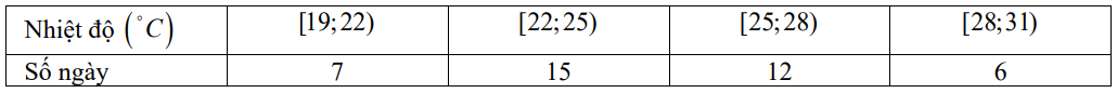 Cho mẫu số liệu ghép nhóm về thống kê nhiệt độ tại một địa điểm trong 40 ngày, ta có bảng số liệu sau: