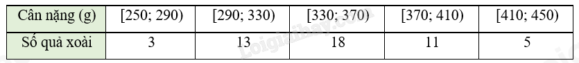 Bảng sau thống kê cân nặng của 50 quả xoài được lựa chọn ngẫu nhiên sau khi thu hoạch ở một nông trường.