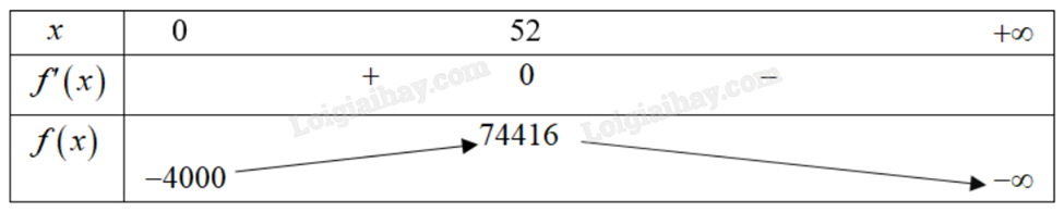\(f'(x) = - 3{x^2} + 150x + 312 = 0 \Leftrightarrow \left\{ {\begin{array}{*{20}{l}}{x = 52}\\{x = - 2}\end{array}\begin{array}{*{20}{c}}{}\\{}\end{array}} \right.\begin{array}{*{20}{c}}{(L)}\\{(TM)}\end{array}\)