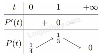 \(P'(t) = 0 \Leftrightarrow - {t^2} - 2t + 3 = 0 \Leftrightarrow \left[ \begin{array}{l}t = 1\,\,(TM)\\t = - 3\,\,(L)\end{array} \right.\)