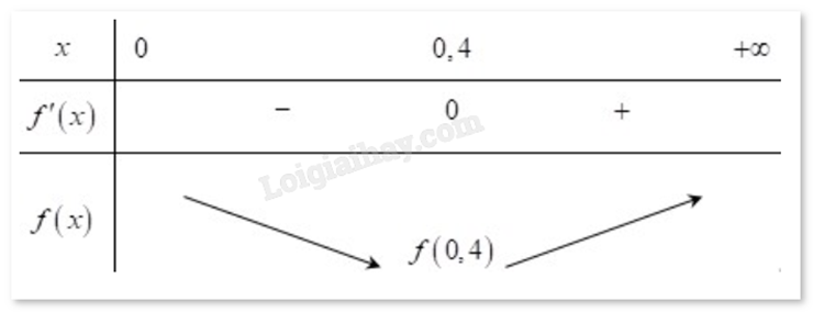 Người thợ dùng loại kính để sử dụng làm mặt bên có giá thành 700000 VNĐ/\({m^2}\) và loại kính để làm mặt đáy có giá thành 1000000 VNĐ/\({m^2}\) (giá thành làm kính đã bao gồm phí gia công). Giá thành của bể cá được xác định theo hàm số sau: \(f(x) = 2.0,6\left( {x + \frac{{0,16}}{x}} \right).700000 + 1000000.x.\frac{{0,16}}{x}\), có bảng biến thiên: