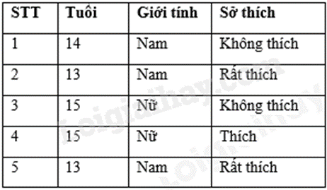Tìm hiểu về sở thích đối với môn bơi lội của 5 bạn học sinh một trường Trung học cơ sở được cho bởi bảng thống kê sau: