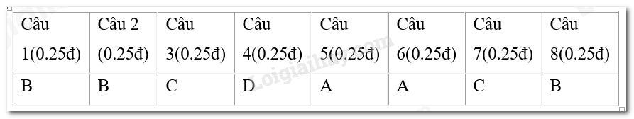 Khoanh tròn vào chữ cái đứng trước phương án trả lời đúng cho các câu hỏi từ 1 đến 8: