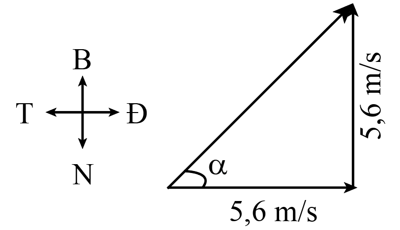 Vận tốc tổng hợp: \(v = \sqrt {5,{6^2} + 5,{6^2}} = 7,92m/s\) theo hướng Đông Bắc