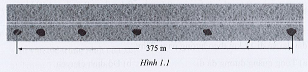Một ô tô chạy thử nghiệm trên một đoạn đường thẳng. Cứ 5s thì có một giọt dầu từ động cơ của ô tô rơi thẳng xuống mặt đường. Hình 1.1. cho thấy mô hình các giọt dầu để lại trên mặt đường.