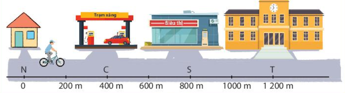 Bạn Nam đi xe đạp từ nhà qua trạm xăng, tới siêu thị mua đồ rồi quay về nhà cất đồ, sau đó đi xe đến trường. Chọn hệ tọa độ có gốc tại vị trí nhà bạn Nam, trục Ox trùng với đường đi từ nhà bạn Nam tới trường.