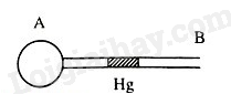 Ở nhiệt độ T0 thì vị trí giọt thủy ngân được biểu diễn như hình vẽ. Biết dung tích bình cầu là không đổi khi thay đổi nhiệt độ. Người ta đun nóng lượng không khí trong bình cầu lên nhiệt độ T > T0 . Xem quá trình biến đổi trạng thái với áp suất là không đổi thì giọt thuỷ ngân sẽ dịch chuyển