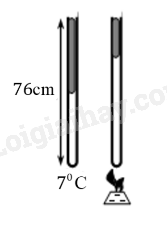 \(\begin{array}{l}\frac{{{p_1}{V_1}}}{{{T_1}}} = \frac{{{p_2}{V_2}}}{{{T_2}}} \Rightarrow {T_2} = {T_1}\frac{{{p_2}}}{{{p_1}}}\frac{{{V_2}}}{{{V_1}}}\\ \Rightarrow {T_2} = {T_1}.\frac{{({p_0} + {h_2})}}{{({p_0} + {h_1})}}.\frac{{{V_2}}}{{{V_1}}} = (7 + 273).\frac{{(76 + \frac{{38}}{3})}}{{(76 + 38)}}.\frac{{190}}{{3.38}} = 363K = 90^\circ C\end{array}\)